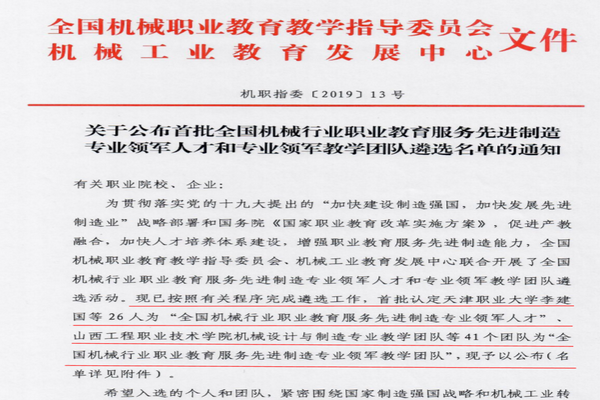 为贯彻落实党的十九大提出的“加快建设制造强国,加快发展先进制造业”战略部署和国务院《国家职业教育改革实施方案》,促进产教融合,加快人才培养体系建设,增强职业教育服务先进制造能力。近期,由全国机械职业教育教学指导委员会、机械工业教育发展中心联合开展的全国机械行业职业教育服务先进制造专业领军人才和专业领军教学团队遴选活动结束。