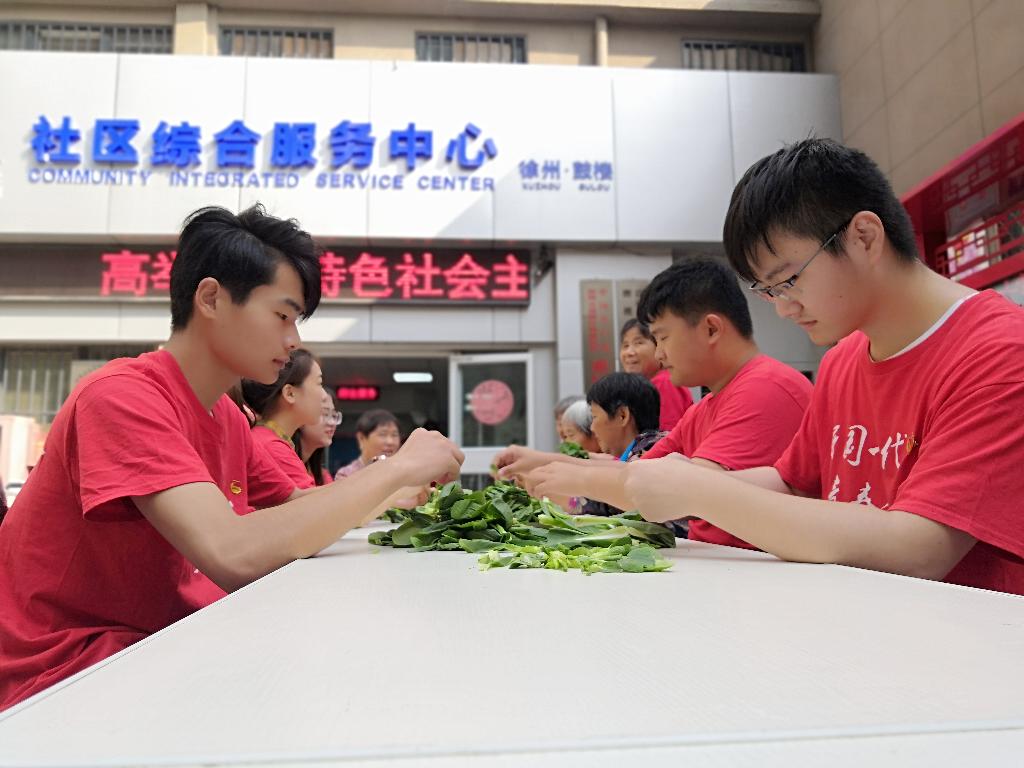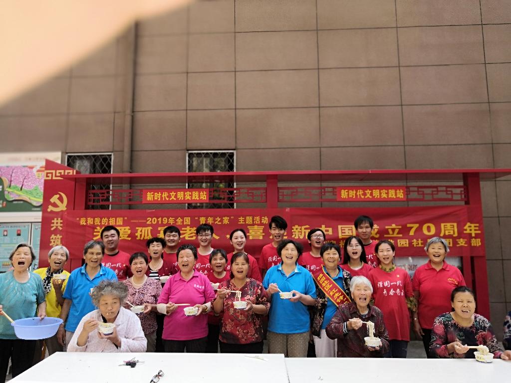 “上-面-咯!”在徐州雅园社区,材料工程学院志愿者们捧出一碗碗热腾腾的面条,在祖国70年华诞之际为“共和国同龄人们”献上一碗“长寿面”,为祖国母亲庆生。仔细地挑拣蔬菜,耐心地听着社区老人拉起家常,聆听着“共和国同龄人们”的青春故事,志愿者们感叹老一辈人的艰苦奋斗,更为成为“强国一代”青年而倍感自豪。自己亲手擀制的面条汇入大锅,好似热血学青年将小我融入大我。志愿者们捧出热气腾腾的“长寿面”,点赞奉献的青春、祝福伟大的祖国。