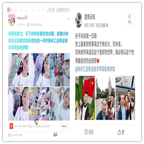 活动中,同学们都晒出对父母的独一无二的祝福,所有的那些感人瞬间、温馨瞬间、快乐瞬间都化为此刻的合影和祝福与大家分享,感恩之心传遍你我。昵称“快乐生活”在朋友圈中写到:“作为男生的我,平时不好意思和妈妈合影,这个活动让我明白爱就要大声说出来。以后每个重阳节我都要和父母合影,坚持十年、二十年、三十年……用实际行动报答养育之恩”。