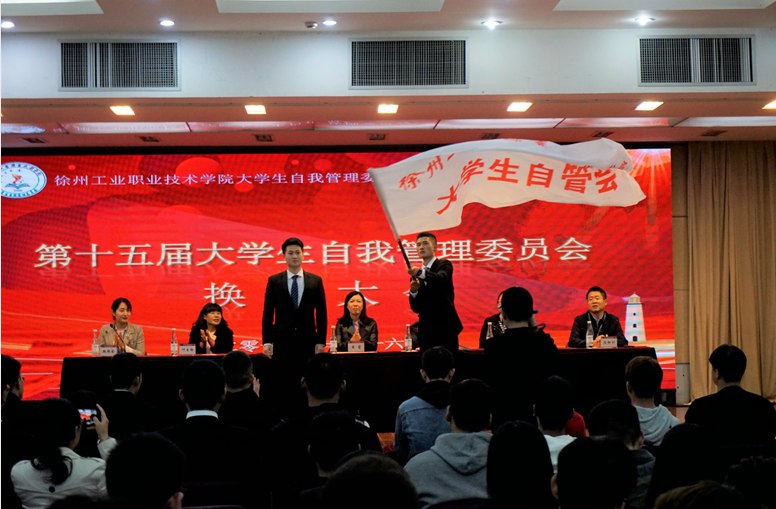 大会在庄严的国歌中拉开了帷幕。第十四届自管会主席刘水同学做2018-2019学年自管会工作总结报告,回顾了一年来十四届自管会在学工处领导下开展的各项工作。学工处处长助理杨涛老师宣读了《第十四届大学生自我管理委员会优秀干部表彰决定》,与会老师为获奖代表颁发荣誉证书。在热烈的气氛中,校团委副书记庞世华老师宣读了《第十五届大学生自我管理委员会干部聘任决定》。两届自管会学生干部代表进行会旗交旗,猎猎招展的会旗寄托着希望和梦想,也传递着责任与担当。随后第十四届自管会主席吴昌金同学做2019-2020学年自管会工作计划报告,表示新一届自管会定会守正出新、再创辉煌。随后,在吴昌金同学的带领下,第十五届大学生自管会学生干部进行了就职宣誓。