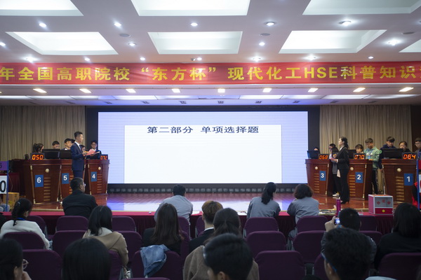 大赛项目分为“东方杯”现代化工HSE科普知识竞赛和“中控杯”现代化工HSE应用技能大赛两个项目。其中“现代化工HSE科普知识竞赛”包括网上预赛和现场决赛两部分。11月7日早晨,参赛选手准时到达大赛现场,经过检录、确认,进入竞赛现场开始比赛,科普知识竞赛全面考察了参赛团队在现代化工安全、健康、环境理念方面的理论知识。