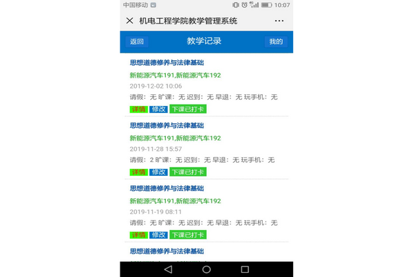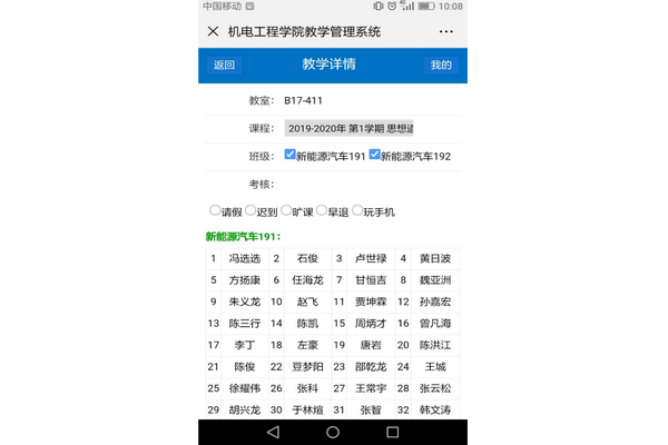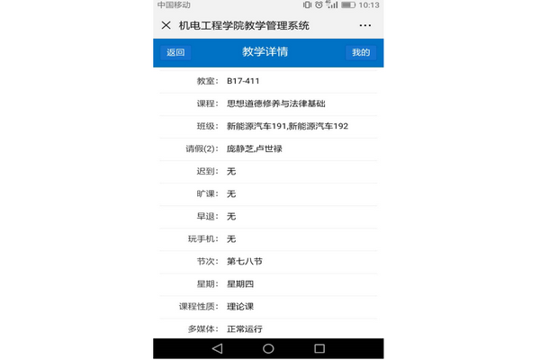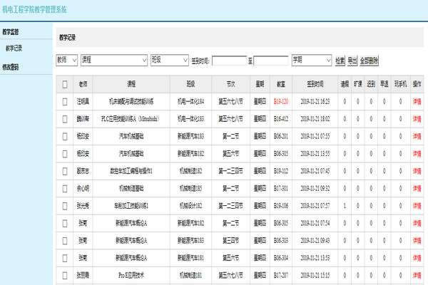 为进一步加强对教师课堂教学、学生课堂纪律的管理,促进学风建设,今年以来,机电工程学院充分运用网络信息技术,开发了机电工程学院教学管理系统;学院能够通过系统第一时间了解教师讲课、学生上课情况;对于存在的问题,能够第一时间掌握,第一时间处理,从而提高工作效率,强化育人效果。