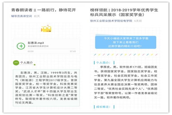 辅导员真谛空间微信公众号“青春朗读者”栏目推出优秀青年学生的榜样事迹,以成长故事的形式引导广大学生向优秀看齐,争做优秀青年。信电学院微信公众号推出“榜样领航”栏目,树立优秀标杆,扩大影响范围。文章自推出以来,反响热烈,广大学生纷纷转发、评论和点赞。