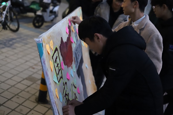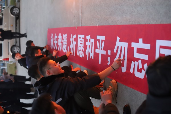 12月13日下午5点,学院团总支组织2019级全体学生开展了国家公祭日主题教育活动。活动由团总支副书记余丽婷同学主持,余丽婷首先为同学们讲述了国家公祭日的由来、历程以及历史意义,带领同学们重温了南京大屠杀的悲痛历史,那些惨痛的场景和饱含血泪的诉说告诉同学们国家公祭日的设立是为了正视这段历史,珍爱和平,唤起了同学们“勿忘国耻 圆梦中华”的责任感和使命感。接着陈昌同学朗诵《和平宣言》,带领同学们一起缅怀遇难同胞,铭记那段困难岁月。随后,全体同学面对蜡烛摆成的“12.13”,集体默哀三分钟,现场气氛肃穆安静,同学们饱含着对先辈们的尊敬,对死难同胞生命的悼念、敬畏和尊重,深切追悼缅怀南京大屠杀中30万死难者。接着,全体同学在学生会主席夏桦带领下,面向国旗庄严宣誓:牢记历史、缅怀先烈;勿忘国耻、圆梦中华;热爱祖国、发奋学习。接下来,各班学生代表在横幅上签字并亲手写下对历史的缅怀和对祖国的祝福,以示牢记历史和守护和平,为祖国繁荣昌盛贡献自己力量的决心。最后,公祭日活动在全体同学合唱《我和我的祖国》 的歌声中落下帷幕,表达对祖国母亲的热爱与祝福。