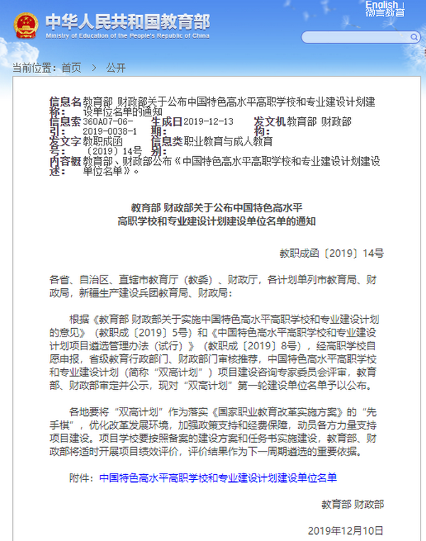 2019年12月18日,《教育部财政部关于公布中国特色高水平高职捕鱼达人破解版 和专业建设计划建设单位名单的通知》(教职成函〔2019〕14号)发布。全国197所高职捕鱼达人破解版 进入“双高计划”,其中,高水平捕鱼达人破解版 建设单位56所、高水平专业群建设捕鱼达人破解版 141所。捕鱼达人破解版 成功入选中国特色高水平专业群建设单位。