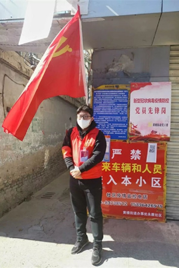第二天,他穿梭在黄楼街道彭校社区拉条幅,参与疫情防护宣传工作,同时也用大喇叭对居民讲解疫情知识,虽然寒风凛冽,但依然阻挡不了他宣传的脚步。2月8日元宵节,刚好遇上下大雪,气温零下6度,本应该是在家和家人一起热热闹闹过节的日子,但是为了居民的安危,他一直坚守在自己的岗位上,面对恶劣的气候条件和艰苦的执勤环境,他没有退缩。晚上六七点的时候进出社区的居民较多,他会主动放下手中的饭菜,做好外来登记与检查工作。