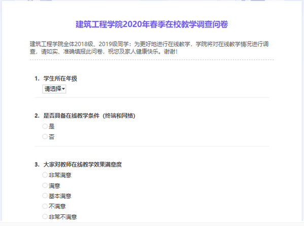 针对问题,开展调研。针对在线教学,师生均存在一段适应期。同时由于客观平台硬件条件的问题,导致了很多学生无法正常的进行在线学习,网络卡顿导致体验不佳等等问题不断出现。为了及时总结在线教学的问题,为后续的在线教学开展奠定基础。建筑工程学院在第一周周末在线发布了学生在线教学调查问卷,并将问卷结果通过在线会议向全体任课教师分享,大家一同研讨解决方案。