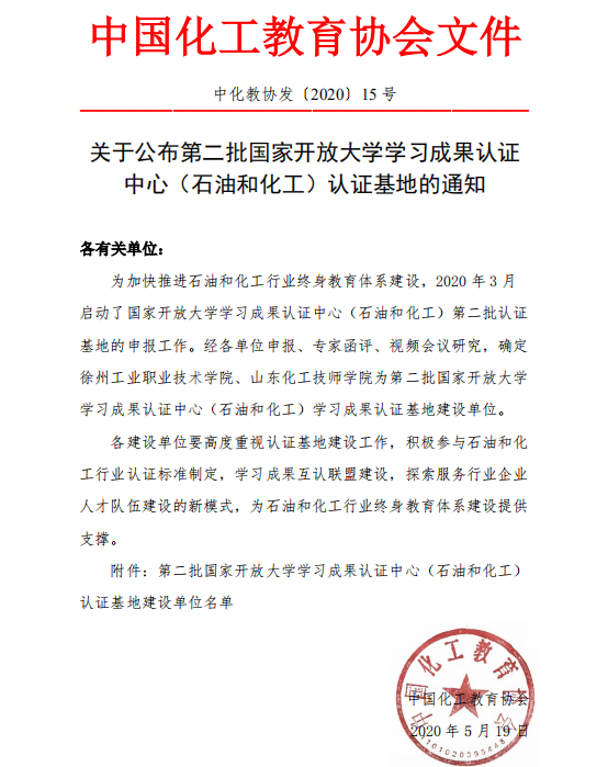 近日,中国化工教育协会发布《关于公布第二批国家开放大学学习成果认证中心(石油和化工)认证基地的通知》(中化教协发〔2020〕15号),捕鱼达人破解版 获批国家开放大学学习成果认证中心(石油和化工)学习成果认证基地建设单位。
