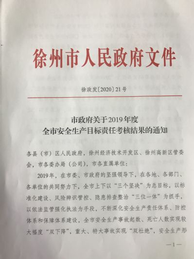 被徐州市人民政府评为“2019年度全市安全生产优秀单位”,捕鱼达人破解版