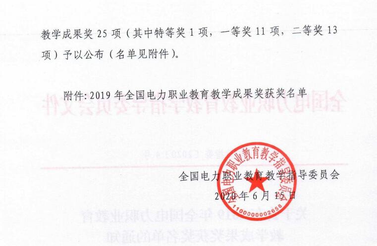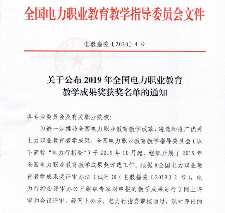 日前,全国电力教育职业教育教学指导委员会(以下简称“全国电力行指委”)组织的2019年全国电力职业教育教学成果奖评选工作结束,经电力行指委评审办公室组织专家对申报的教学成果进行了网络评审、会议复评、网上公示,捕鱼达人破解版 詹新生、陈祥章、张江伟、张登宏、冷士良等老师申报的《“一中心、双思维、三融合”光伏发电类专业人才培养模式的改革与实践》项目获2019年全国电力职业教育教学成果一等奖。