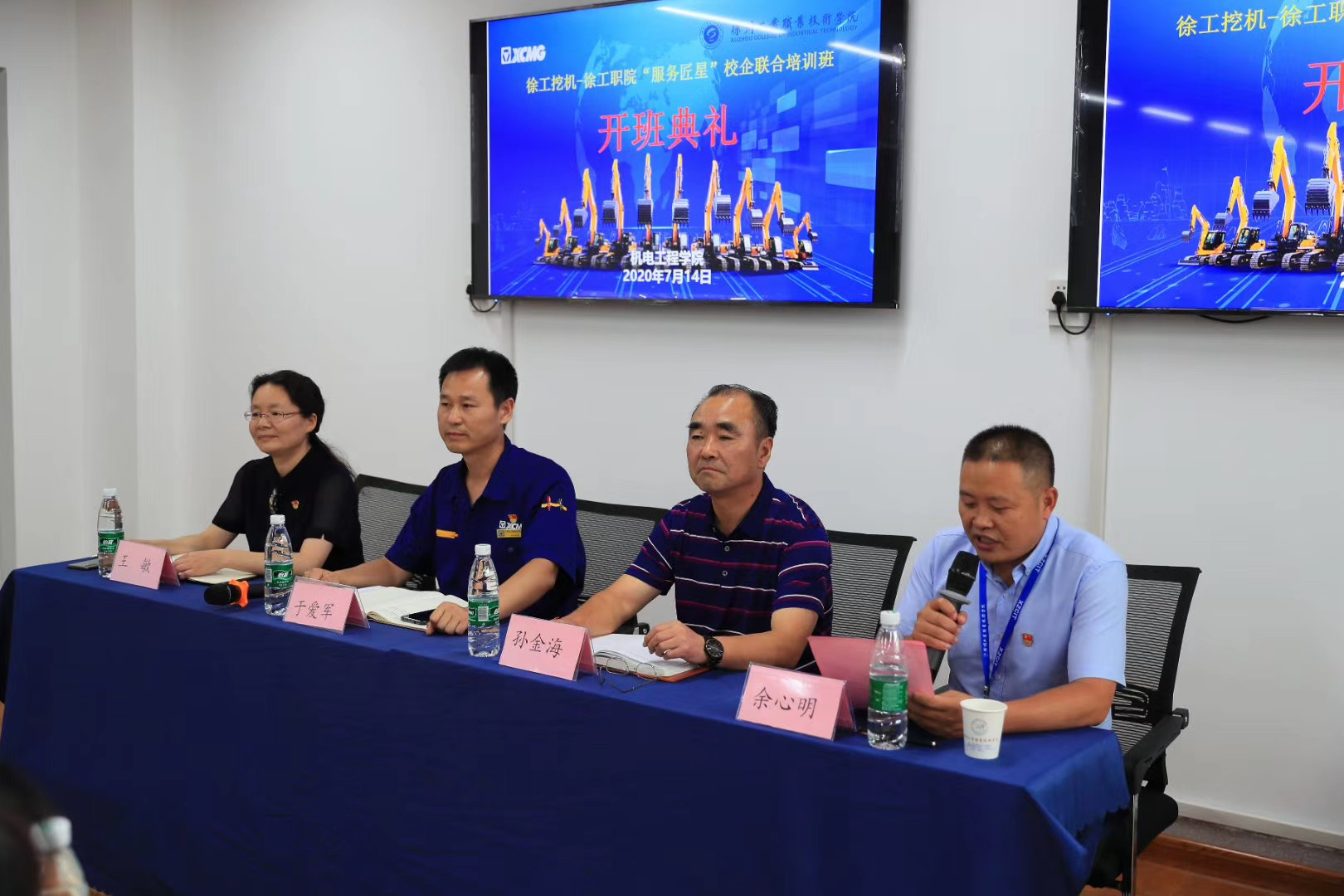 近日,徐工挖掘机械事业部、机电工程学院在捕鱼达人破解版 B16-302培训教室隆重举行第一期“服务匠星”校企联合培训班开班典礼。徐工挖掘机械事业部党委书记于爱军、人力资源部长余峰、营销公司服务培训经理戴汶秀出席。机电工程学院院长孙金海、党总支书记王敏、副院长徐昆鹏、全体参训教师和20位徐工挖机代理商学员参加开班典礼,副院长余心明主持开班仪式。