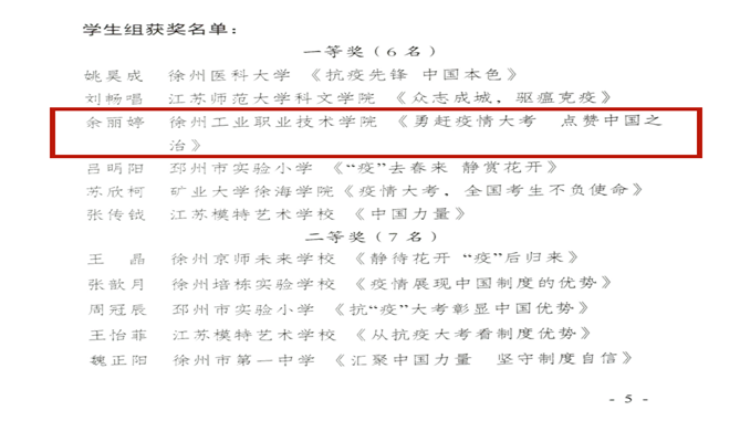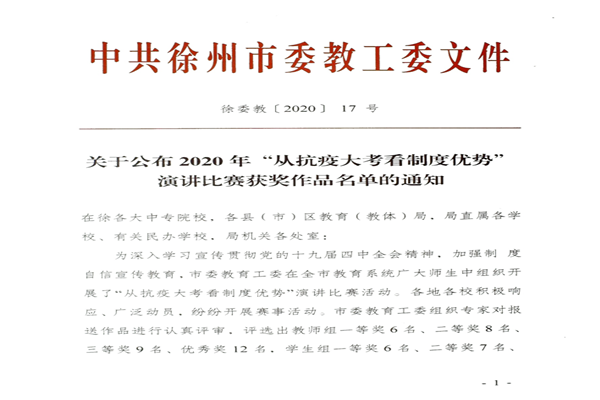 近日,由徐州市委教育工委面向全市教育系统广大师生组织的“从抗疫大考看制度优势”演讲比赛落下帷幕。捕鱼达人破解版 机电工程学院余丽婷同学以优异成绩从128位参赛选手中脱颖而出荣获大赛一等奖。