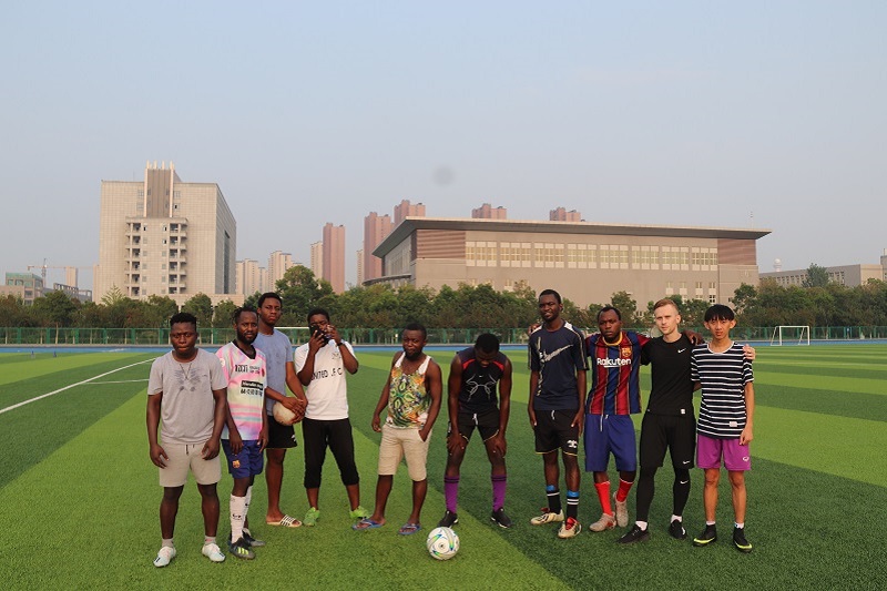 足球是世界性的体育文化活动。8月28日-9月5日,国际学院组织留学生进行了足球联赛。绿茵赛场上,竞显英雄豪杰;竞技过程中,充满火药的气味。裁判哨声一响,激烈的比赛瞬间被点燃。只见皮球在双方的脚下左右翻滚,一方进攻如行云流水,水银泻地;一方防守如铜墙铁壁,密不透风,激烈的交锋,让旁边的观众目不转睛,全神贯注,生怕错过了进球的瞬间。同学们在足球赛中增进了各国学生之间的友谊,强健了学生体魄,提高抵抗病毒的能力。