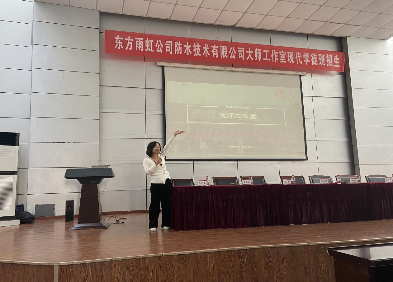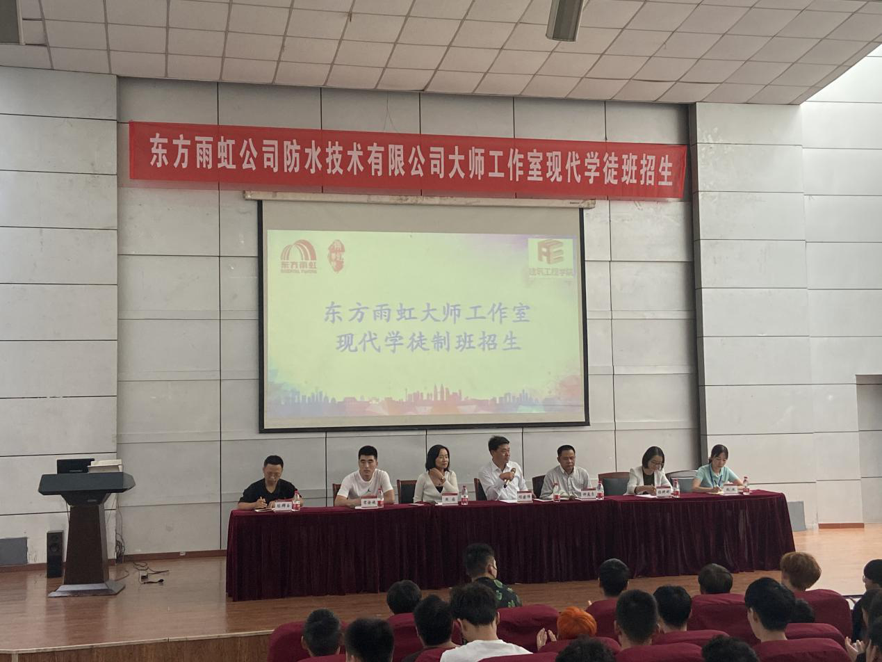 建筑工程学院共同举办的“东方雨虹大师工作室现代学徒制班组班仪式”在学术报告厅顺利举行。东方雨虹集团雨虹学院院长周园、技能大师钟友良、建筑装饰专家宋合斌和建筑工程学院的负责同志共同出席此次组班仪式。