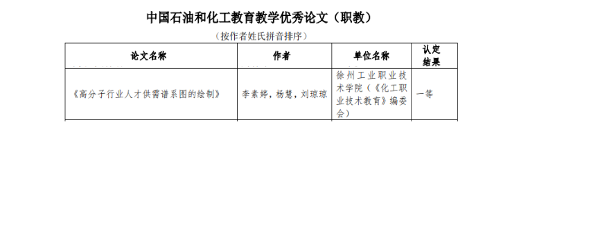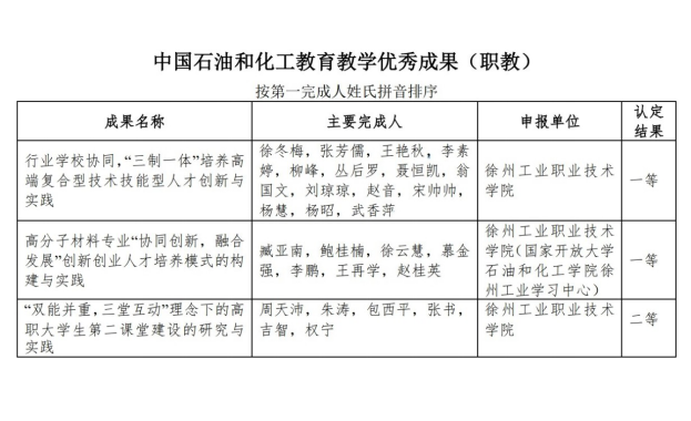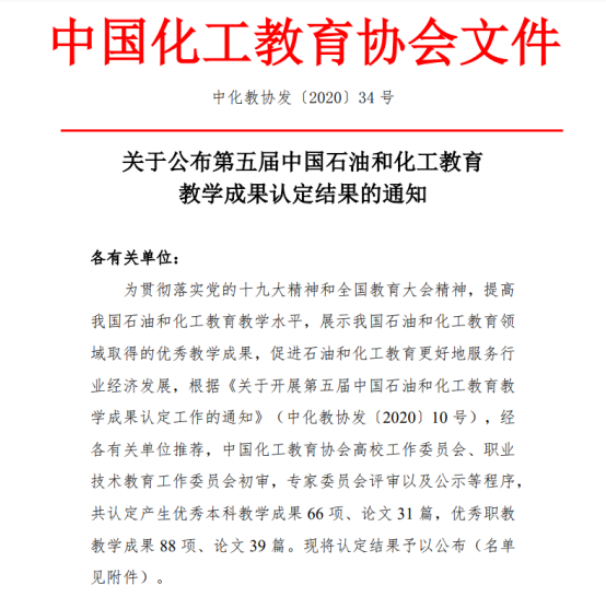 根据中国化工教育协会《关于公布第五届中国石油和化工教育教学成果认定结果的通知》(中化教协发〔2020〕34号),由捕鱼达人破解版 完成的《行业捕鱼达人破解版 协同,“三制一体”培养高端复合型技术技能型人才创新与实践》《高分子材料专业“协同创新,融合发展”创新创业培养模式的构建与实践》荣获中国石油和化工教育教学优秀成果(职教)一等奖,《高分子行业人才供需谱系图的绘制》荣获中国石油和化工教育教学优秀论文(职教)一等奖,《“双能并重,三堂互动”理念下的高职大学生第二课堂建设的研究与实践》荣获中国石油和化工教育教学优秀成果(职教)二等奖。