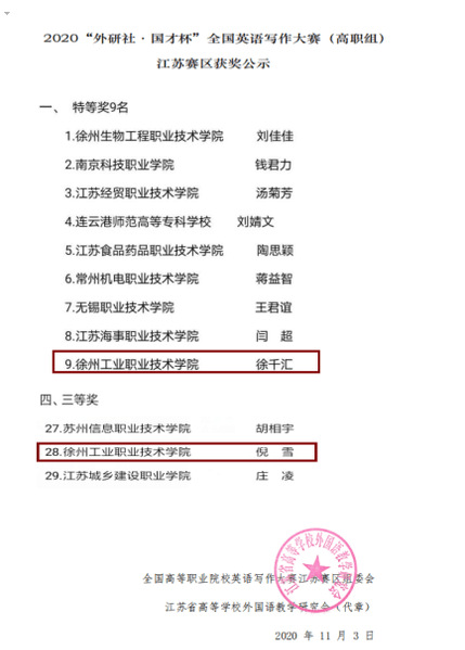 11月1日,第十届“外研社·国才杯”全国英语写作大赛江苏赛区复赛在扬州市职业大学举行,来自江苏省60所高职院校的140 名选手参加了比赛。经过激烈角逐,捕鱼达人破解版 选派的2名选手全部获奖。张宇老师指导的高分子181(3+2)班倪雪同学获公共英语组三等奖;霍娜老师指导的高分子191(3+2)班徐千汇同学获公共英语组特等奖,她将代表江苏赛区参加全国总决赛。