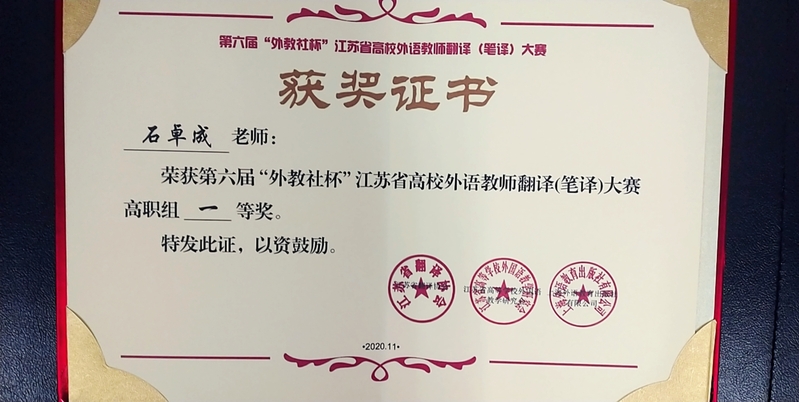 11月20日-21日,第六届“外教社杯”江苏省高校外语教师翻译(笔译)大赛在常州工学院成功举行,全省四十个高职院校共40名老师参加了高职组的比赛。捕鱼达人破解版 国际教育学院石卓成老师代表捕鱼达人破解版 参加本次比赛,荣获大赛一等奖。