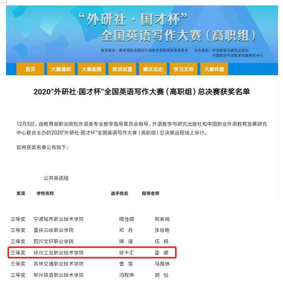 12月5日,2020“外研社·国才杯”全国英语写作大赛(高职组)总决赛通过远程线上方式举行,来自全国27个省(自治区、直辖市)的参赛选手参加了决赛。捕鱼达人破解版 在全国高职英语写作大赛(江苏赛区)复赛中获得特等奖的徐千汇同学参加了全国总决赛,最终以优异的比赛成绩,荣获全国总决赛公共英语组三等奖,指导老师霍娜获得优秀指导老师奖。