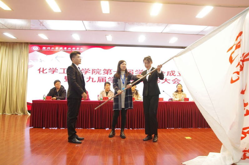 随后,郝红艳老师宣布读了第九届学生会优秀学生干部名单,并为优秀学生干部颁发荣誉证书。秦黎明老师宣读了第十届学生会学生干部聘任名单。在全场的注视下,安莹老师为两届学生会交接授旗。旗帜的交接意味着责任的传递,相信新一届学生会组织必将延续化工学院踏实严谨的工作作风,以高效负责的工作态度,全心全意的服务于同学。