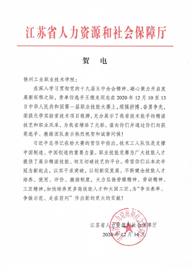 贺电中指出:“在深入学习贯彻党的十九届五中全会精神、凝心聚力开启发展新征程之际,贵单位选手王德龙同志在2020年12月10至13日中华人民共和国第一届职业技能大赛上,顽强拼搏、奋勇争先,荣获化学实验室技术项目银牌,充分展示了我省技术能手的精湛技艺和职业风采,为我省增添了光彩。谨向你们并通过你们向获奖选手、教练团队表示热烈祝贺和诚挚问候!希望你们以本次夺冠为新起点,以实干求突破,以创新促发展,不断健全技能人才培养、使用、评价、激励制度,大力弘扬劳模精神、劳动精神、工匠精神,加快培养更多高技能人才和大国工匠,为“争当表率、争做示范、走在前列,作出新的更大的贡献!”