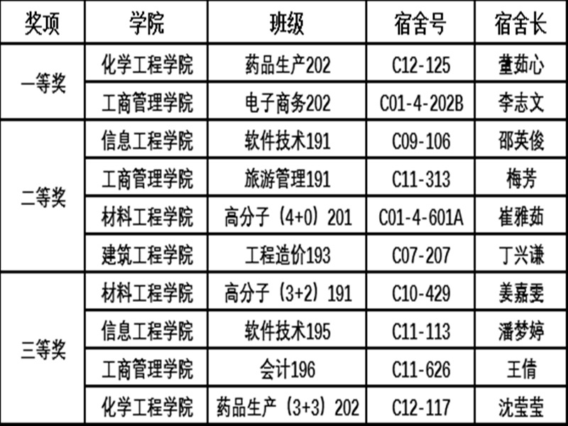 第十九届大学生宿舍文化节“宿舍长能力大赛”获奖名单如下: