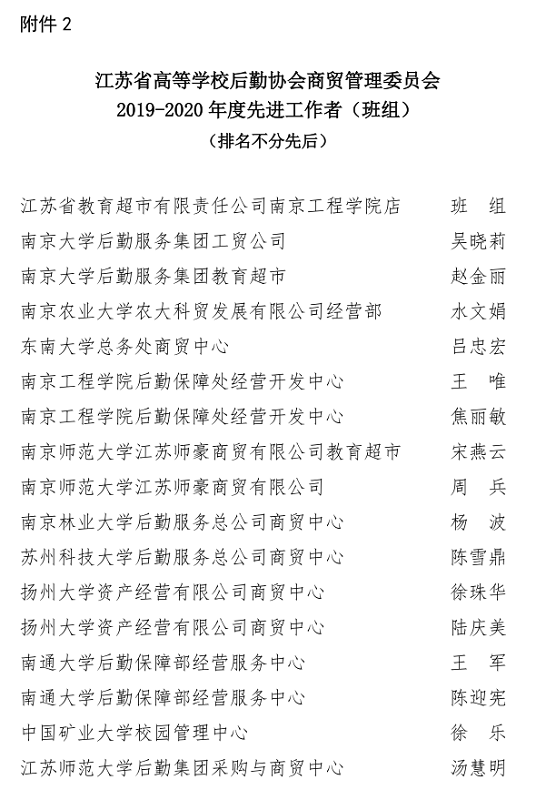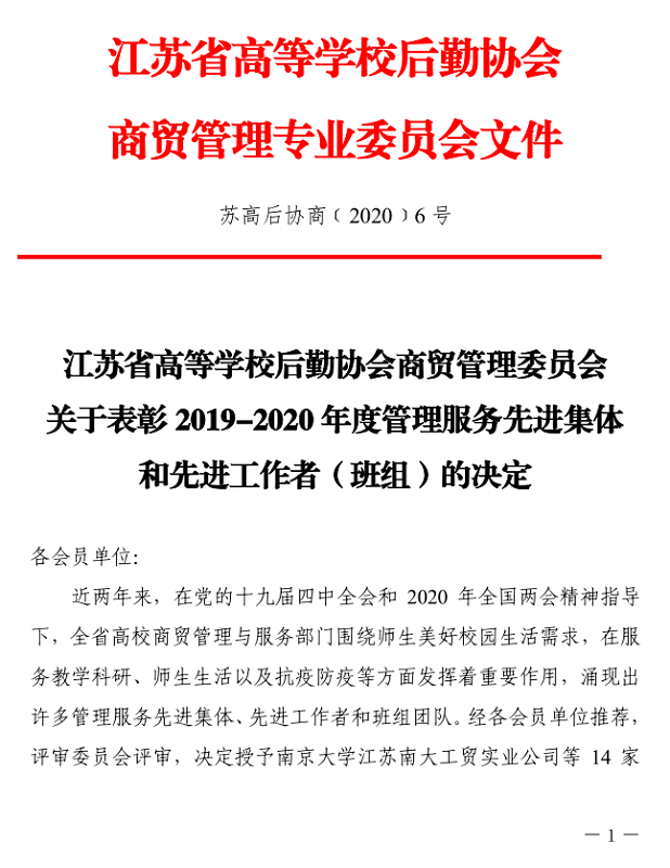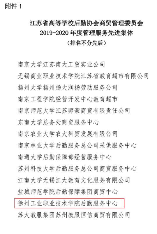 根据江苏省高校后勤协会商贸管理专业委员会“关于开展评选2019-2020年度管理服务先进集体和先进工作者活动”的通知要求,捕鱼达人破解版 后勤服务中心积极申报参加评选,凭借精细化的管理水平和踏实的工作作风,后勤服务中心获得了“2019-2020年度管理服务先进集体”称号,中心物业管理科科长周强同志获得了“2019-2020年度先进工作者”称号。
