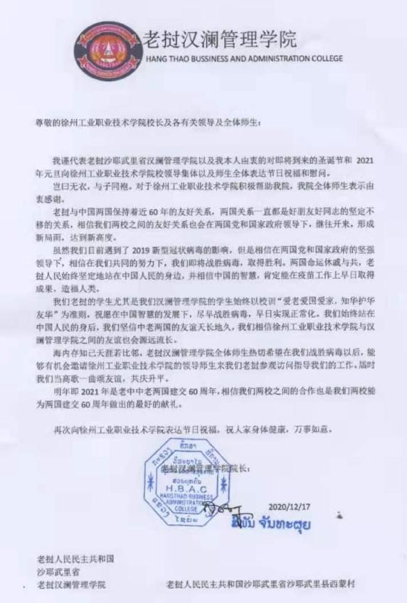 老挝汉澜管理学院院长Bountheuang Mounlasy博士用中文写了一封热情洋溢的信,表示了对捕鱼达人破解版 全体师生的节日慰问,感谢捕鱼达人破解版 在过去对他们捕鱼达人破解版 的各种帮助;期待疫情结束后,继续推动与捕鱼达人破解版 各项国际交流事业的发展,增强两校之间的友谊,并以此作为2021年中老两国建交60周年的最好献礼。