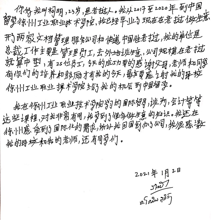 近日,捕鱼达人破解版 2017级老挝籍毕业生SOULIVONG KOMIN(柯明)发来感谢信,表达了对母校培养教育的感激之情,并分享了自己目前在老挝的创业历程。柯明是捕鱼达人破解版 2017级国际贸易专业老挝籍留学生,在校期间曾担任老挝学生自管会主席,无论是学业还是各项活动都表现出色。目前,柯明在老挝开办了一家文档服务和国际物流公司,主要从事老挝与中国的留学服务和物流生意。公司有25名员工,规模在老挝当地属于中型企业。