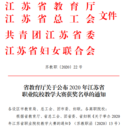 根据省教育厅12月31日发布的《省教育厅关于公布 2020 年江苏省职业院校教学大赛获奖名单的通知》(苏教职〔2020〕22 号)文件,捕鱼达人破解版 进入省赛决赛的6支教师团队全部获奖,荣获一等奖2项、二等奖2项、三等奖2项,一等奖数量位列省22所高水平院校第2位,实现较大突破。