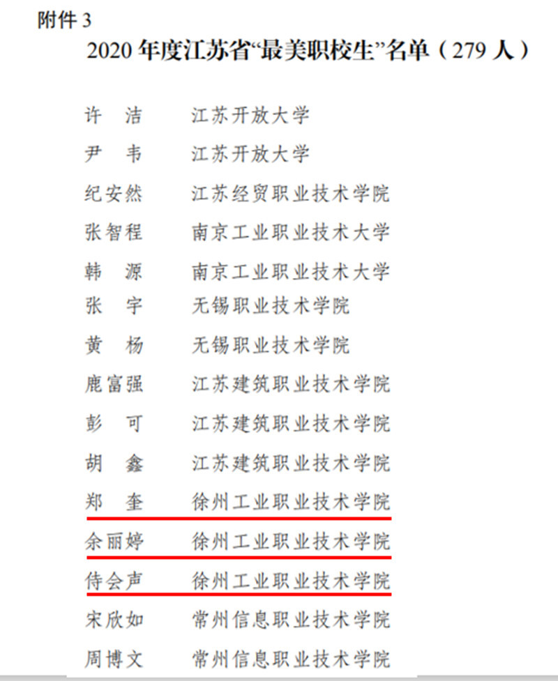 近日,由共青团江苏省委、江苏省教育厅共同举办的2020年度全省“最美职校生”寻访活动结果揭晓,捕鱼达人破解版 机电工程学院侍会声、汽车工程学院余丽婷、材料工程学院郑奎等三名同学荣获“最美职校生”荣誉称号。