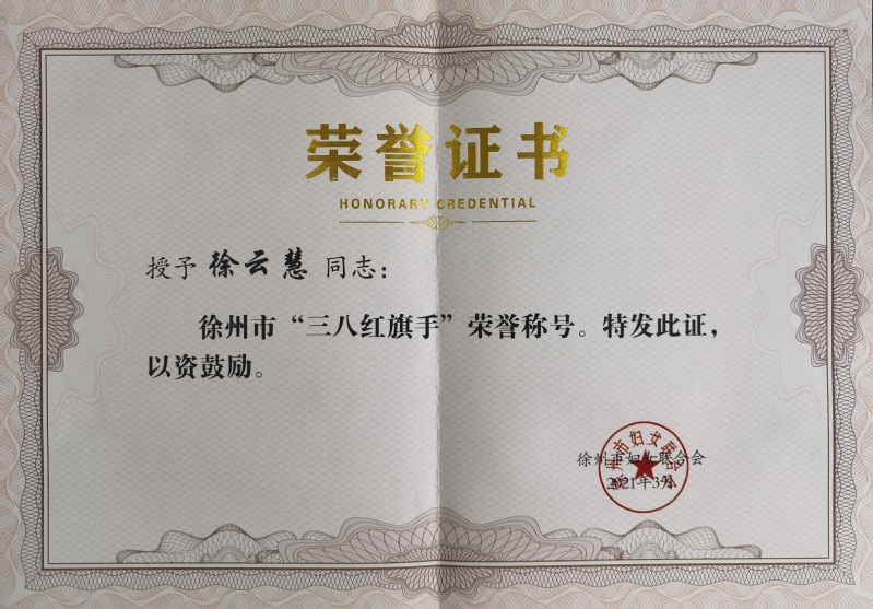 荣获“徐州市三八红旗集体”,徐云慧老师荣获“徐州市三八红旗手”荣誉称号。此次共授予58个徐州市三八红旗集体,100个徐州市三八红旗手。