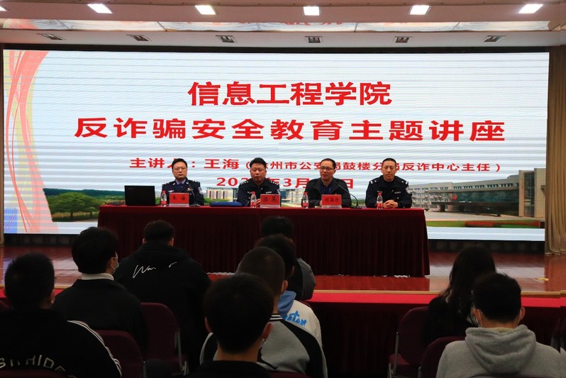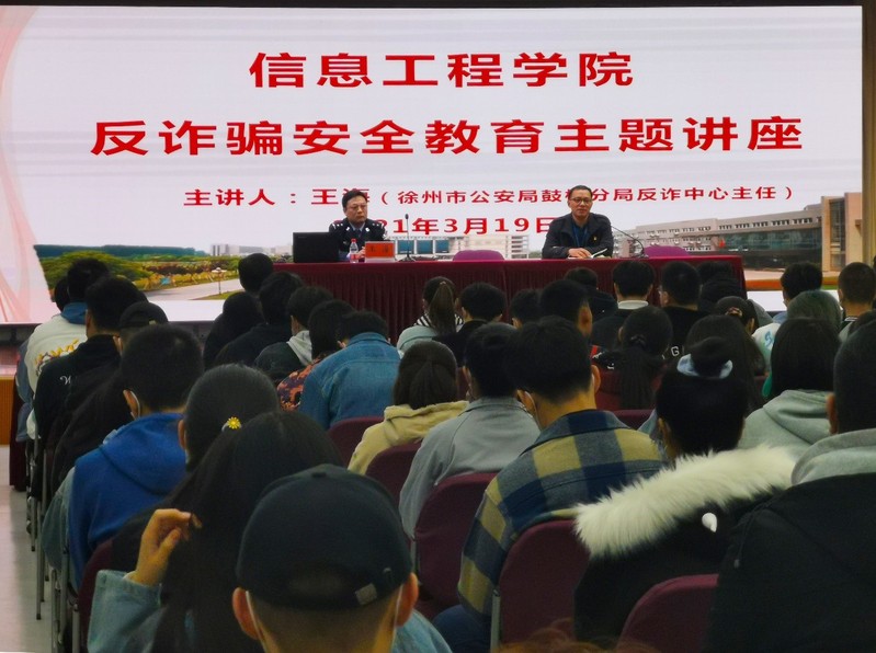 为了进一步增强我院大学生对于电信网络诈骗的防范意识,营造安全、文明、和谐的校园环境,切实保障在校学生的财产安全, 3月19日下午我院邀请到了徐州市公安局鼓楼分局反诈中心王海主任,为我院学生讲授了一堂精彩生动的校园反诈骗安全教育主题讲座。徐州市公安局鼓楼分局九里派出所副所长梁昊、驻校民警令军应警官,学院副书记韩永印及各年级辅导员也出席本次活动。讲座由学院党总支书记刘海涛主持。