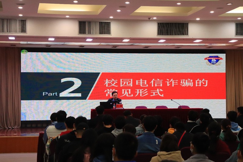 王海主任围绕“什么是电信诈骗”、“电信诈骗的常见形式”、“如何识别防范电信诈骗”及“上当后的补救措施”等四个方面,结合自己的办案经历,用一些生动鲜活的真实案例向老师同学们做了详细剖析。他向与会师生讲到,虽然诈骗的种类和手段多种多样,但只要大家树立较强的防诈骗意识,克服内心的不良心理,保持应有的清醒,就可以避免上当受骗。讲座的最后,王主任提出了预防电信诈骗的“五不要”:不要轻信不明对象及可疑信息;不要因贪小利而受违法短信的诱惑;不要拨打短消息中的陌生电话;不要向陌生人汇款、转账;不要泄露个人信息,特别是银行卡信息。