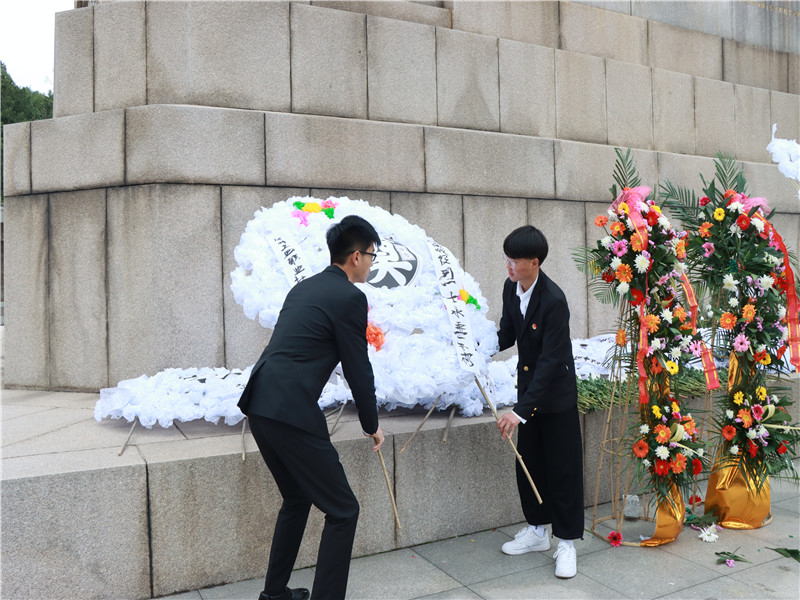 伴着哀悼乐,青年代表向烈士纪念碑敬献花圈,全体三鞠躬,怀着无比崇敬的心情敬献花束,绕塔瞻仰。青年代表为师生们讲述了淮海战役的历史与背景,青年们怀着崇高的敬意,走过浮雕长廊及烈士名单墙,反思战争的残酷与当下和平的来之不易。随后,青年们在主题横幅上签名承诺,向为今天幸福生活献出生命和鲜血的革命先辈们致敬默哀,寄托对革命先烈的无限缅怀和深切思念。