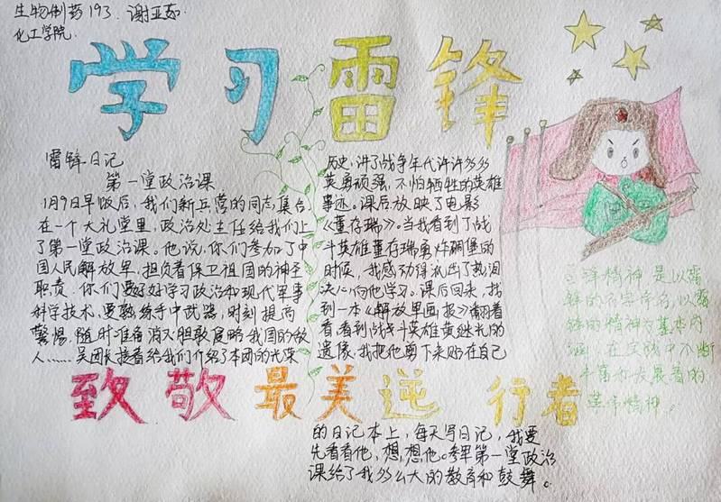 学习雷锋事迹,吸收浩瀚的雷锋力量,化学工程学院从理论学习和实际践行出发,激发同学们的服务奉献精神。2021年3月21日,化工学院开展了以“热议雷锋事迹,学习雷锋精神”、“丹青书法,墨林之风,学习雷锋事迹,揄扬雷锋精神”为主题的学习活动。内容丰富,形式多样的PPT,告诉大家何为雷锋精神,为何学习雷锋精神。