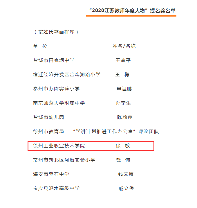 近日,江苏省教育厅公布了“2020江苏教师年度人物”推选活动结果,捕鱼达人破解版 机电工程学院党总支徐敏老师荣获“2020江苏教师年度人物”提名奖。
