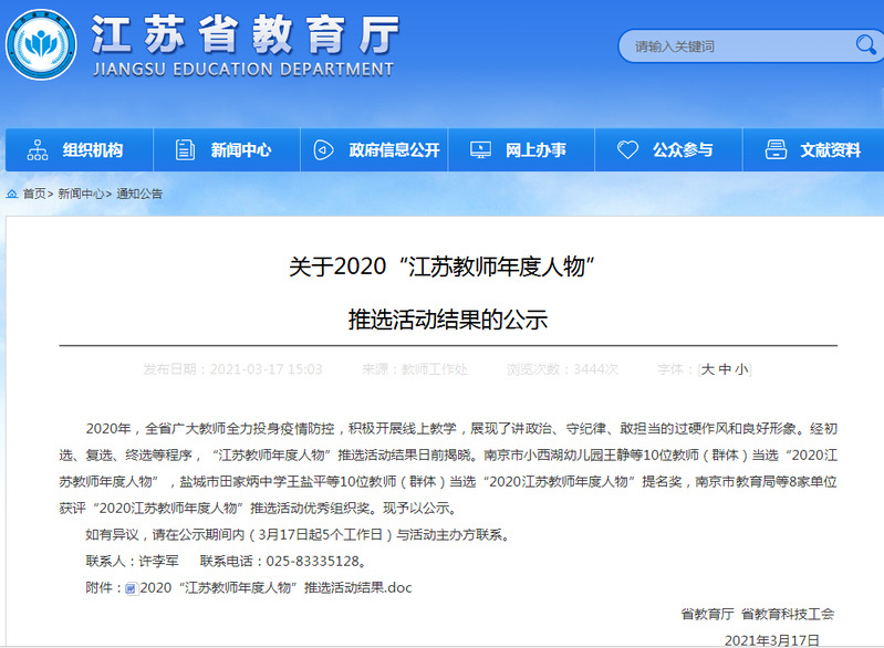 根据《省教育厅省教育科技工会关于开展“2020江苏教师年度人物”活动的通知》(苏教师函〔2020〕27号)文件精神,人事处广泛动员,积极组织申报和遴选推荐。经初选、复选、终选等程序,全省最终确定“10位教师(群体)当选“2020江苏教师年度人物”,10位教师(群体)当选“2020江苏教师年度人物”提名奖,8家单位获评“2020江苏教师年度人物”推选活动优秀组织奖。此次表彰对象都是全省各级各类捕鱼达人破解版 在教书育人、抗击疫情方面作出积极贡献的个人或群体,广受师生好评。