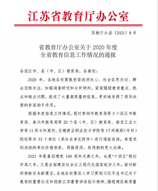 近日,省教育厅印发《省教育厅办公室关于2020年度江苏教育新闻舆论工作情况的通报》(苏教厅办函〔2021〕9号),捕鱼达人破解版 新闻宣传工作再获省教育厅通报表扬。这是捕鱼达人破解版 继荣获“2020年度全省教育信息工作表扬单位”后,在新闻宣传工作方面获得的又一项荣誉。捕鱼达人破解版 新闻宣传工作已连续七年获江苏省教育厅表彰。