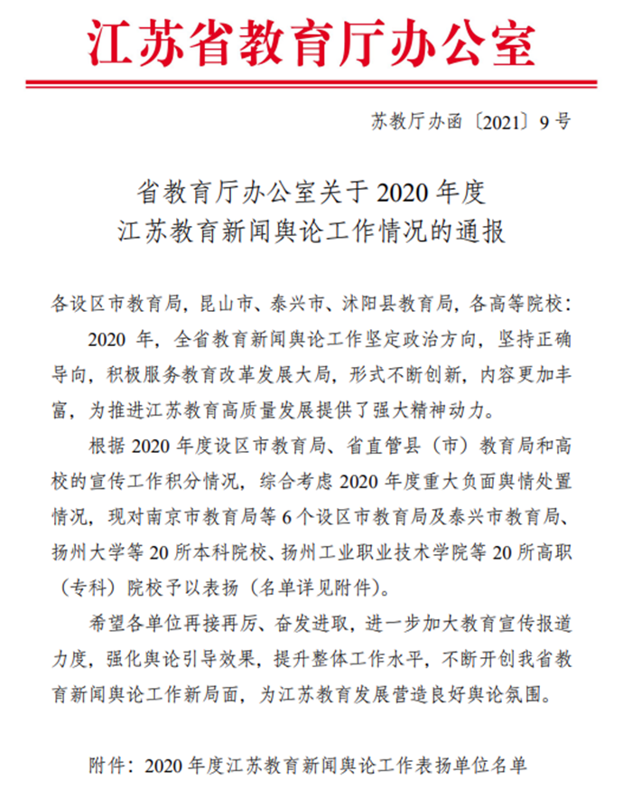 2020年度江苏教育新闻舆论工作表扬单位主要依据新闻舆论宣传工作积分情况,综合考虑2020年度重大负面舆情处置情况评比选出,是江苏省教育新闻宣传工作方面官方认定的最高荣誉称号。今年共评选表彰了7个设区市教育局和20所本科院校、20所高职(高专)院校。