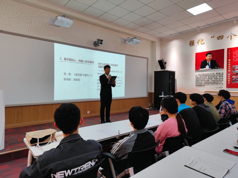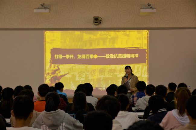 首先,孟丽萍老师由一段93岁抗美援朝老兵在颁奖现场高唱军歌、匍匐前进,随时准备跃起冲锋的视频引入党课主题,随后,孟老师从什么是抗美援朝精神、抗美援朝的历程、抗美援朝的实质、抗美援朝神的内涵、在新时代应如何发扬抗美援朝精神五方面向大家讲述了中国在抗美援朝中的历史贡献。孟丽萍向青年学生发起呼吁,新时代青年一代应积极发扬抗美援朝精神:应具有不畏强暴、反抗强权的民族风骨;应看到万众一心、勠力同心的民族力量;应具有舍生忘死、向死而生的民族血性;应激发守正创新、奋勇向前的民族智慧。活动最后,由2020级郭骁枭同学为大家朗诵了作家魏巍从朝鲜战场归来后所著报告文学《谁是最可爱的人》。