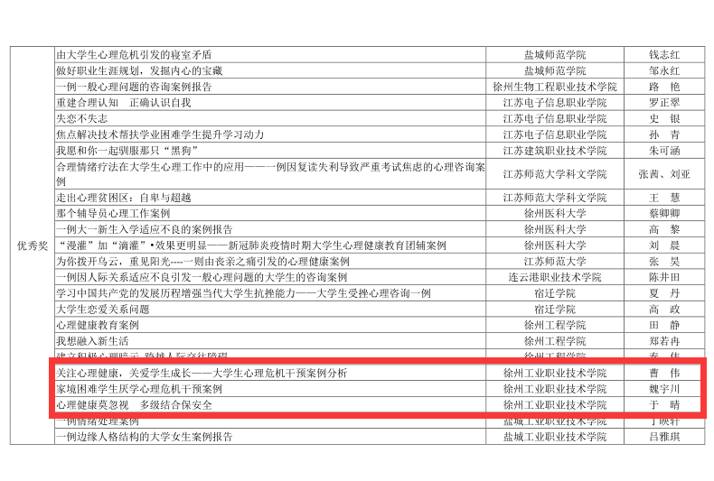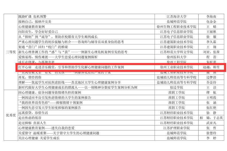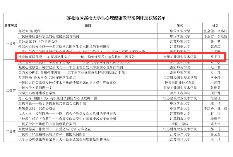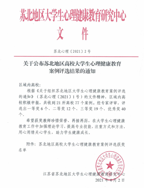 近日,在苏北地区大学生心理健康教育研究中心组织的心理健康教育案例评选中,捕鱼达人破解版 申报的五项案例作品荣获多项荣誉。其中《精准滴灌深伴爱,如履薄冰化危机——一例由抑郁症引发自杀危机的干预报告》(马千珉)荣获一等奖,《打开心扉,走进音乐殿堂,引导和帮助学生化解心理健康问题的工作案例》(赵越、韩雪)荣获三等奖,《关注心理健康,关爱学生成长——大学生心理危机干预案例分析》(曹伟)、《家境困难学生厌学心理危机干预案例》(魏宇川)、《心理健康莫忽视,多级结合保安全》(于晴)荣获优秀奖。