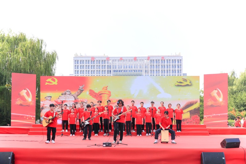 歌咏比赛在大学生纯蓝吉他社、大学生合唱团激情洋溢的《国际歌》弹唱中拉开序幕。各党总支先后歌唱了《太行山上》、《党啊,亲爱的妈妈》、《我的中国心》、《我们走在大路上》等经典曲目,校大学生艺术团真情演绎了舞蹈《绣红旗》。