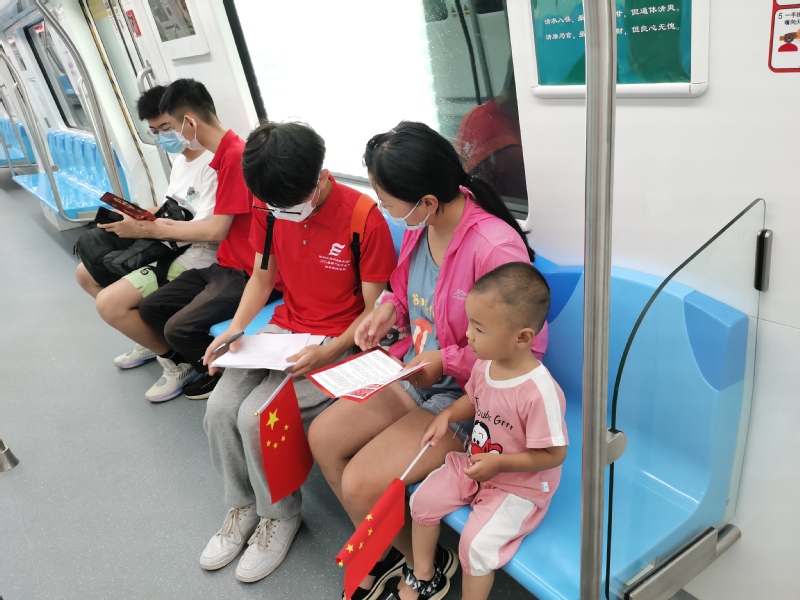 7月15日,实践团队一行走进徐州地铁2号线、3号线,在地铁路线沿途发放百年党史宣传册,一对一地对乘客进行党史知识宣讲。团队成员根据宣传手册,穿插精心准备的党史小故事,用通俗易懂的方式宣传党史知识。同学们在宣讲的过程中,不时与乘客互动交流,现场气氛轻松活跃。物联网学徒制191班贾钰琪同学在向一位老大爷宣讲党史知识时,大爷介绍自己是一名老党员,他表示很欣慰地看到青年学生能够主动学习党史知识,勇担党史宣传使命,将党史宣传教育普及到普通民众之中,并分享了自己的初心故事。得到了乘客的肯定,同学们更加深刻地理解了此次活动的意义。