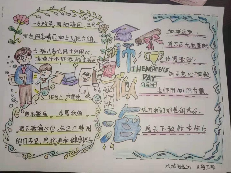 又是一年的流光溢彩,又是一年的桃李芬芳。在这绚丽而富有诗意的金秋时节,第三十七个教师节踏歌而来。在教师节之际,机电工程学院团总支精心组织,充分发动基层团支部,向全院学生发出庆祝教师节的祝福活动倡议,掀起了感谢师恩的热潮。同学们发挥自己丰富的想象和动手能力,通过发手机祝福短信、群内接龙、录制唱给老师的歌、录制送给老师的祝福视频、制作手抄报、撰写书法等活动,在QQ空间发表对老师的祝福,笔尖绘心意,声音言恩情,表达了对老师的热爱、关心和尊重。