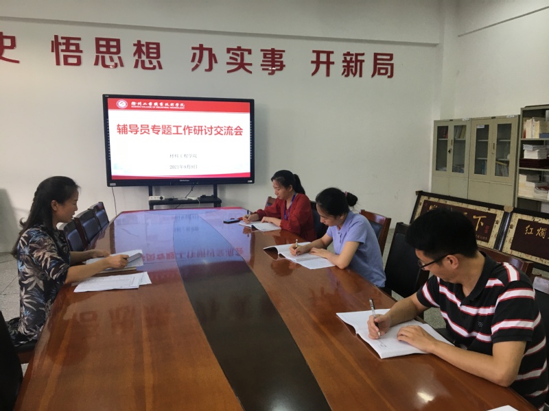 9月9日下午,材料工程学院在B05-306举行新学期第一次辅导员专题工作研讨学习交流会,学院党总支副书记周树会就如何做好辅导员工作进行了交流,学院全体辅导员参加了会议。