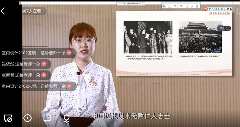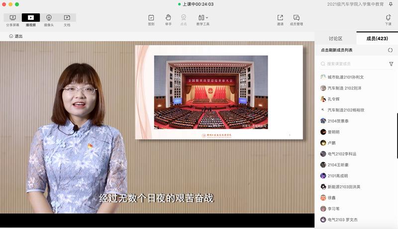 曾晓副教授以“进入大学之后,你们最想做什么?”开题,从1840年鸦片战争开始,通过详实细致的历史记录和感人至深的红色故事,带领同学们回顾了我国的历史发展进程,勉励青年学生要勇于进取,不断挑战,在大学期间应当尝试更多的可能,完成新的蜕变,在时代的变革中砥砺前行。
