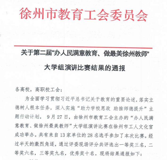 9月27日下午,由徐州市教育工会委员会主办的第二届“办人民满意教育、做最美徐州教师”演讲比赛落下帷幕,捕鱼达人破解版 选派杨晶、唐梦两位老师参赛。全市大中专院校共选拔推荐28位教师参赛,经过激烈角逐,捕鱼达人破解版 两位老师双双获得“二等奖”的优秀成绩。