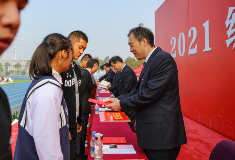 祝木伟书记致辞。祝书记代表党委和全校师生员工对4579名2021级新同学表示热烈的欢迎,对同学们开启大学生活提出了三点期望和要求:第一,认识自我。通过理论学习、技能训练、比赛竞赛、社团活动、服务师生来找到自我;客观认识、分析自己的身体、能力和价值,评判自己的优点和缺点来平视自我;以客观、长远、辩证的眼光看待自己,悦纳自我;在不断地学习、反思和他人的镜鉴中完善自我。第二,学会独立。要做好学业生涯规划、职业生涯规划和时间规划,学会自主学习;要学会独立思考、独立解决问题、处理好人际关系。第三,承担责任。要承担学习的责任,掌握知识,学好技能;要承担家庭的责任,把握当下,不负家人;要承担国家和社会的责任,服务人民,贡献国家。希望同学们都能在徐工职院找到最真的自己,成就最好的自己。