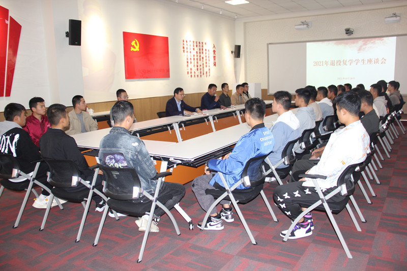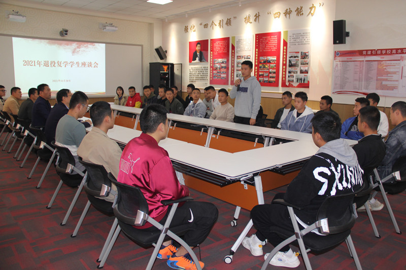 在随后的座谈中,同学们分别进行了自我介绍,他们有的服役于南海舰队、有的服役于西藏祁发宝连队,有的服役于空军基地,有的服役于火箭军,有武警战士也有坦克兵,涵盖了海、陆、空、火箭军、武警等多兵种。同学们各自分享了自己在部队的经历、感受和收获,畅谈了退役复学后的学习生活规划。他们结合自己的实际情况提出需要解决的问题和面临的困难,与会老师进行了详细解答。药品生产202班的殷彬彬同学作为学生代表在发言中动情的说“经过两年军旅生涯的锤炼,不仅拥有了强壮的身体,还磨炼了坚韧的意志,更成就了一个更优秀、更自律的自己,军旅生活是一次宝贵的成长经历,复学后会牢记入伍誓言,发挥优势,努力学习。”