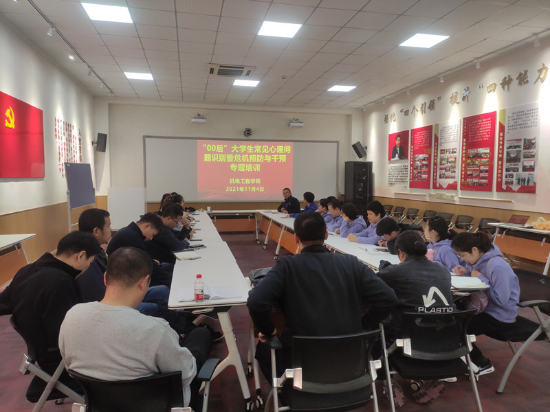 为更好开展学生心理健康教育工作,为学生健康成长保驾护航,11月4日上午,机电工程学院邀请到捕鱼达人破解版 大学生心理健康教育与咨询中心主任马千珉老师在图书馆1楼智慧党建室开展主题为《“00后”大学生常见心理问题识别暨危机预防与干预》专题培训。学院高度重视,院党总支书记王敏、党总支副书记王贵锋、全体辅导员、班主任参与到本次培训中,培训由王贵锋副书记主持。